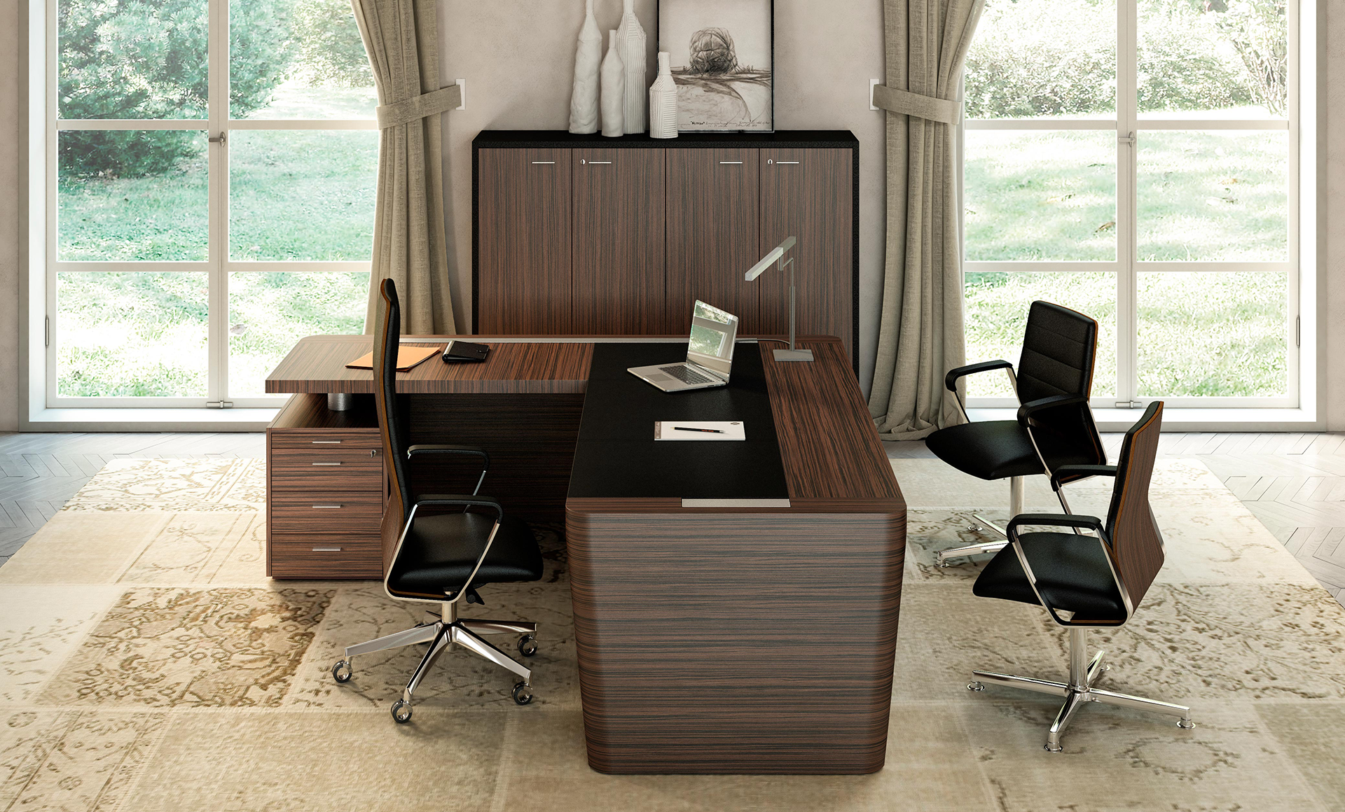 Elogio del equilibrio entre materia y forma. Los escritorios dan prioridad a la elegancia de las formas y a la riqueza en la composición de los volúmenes, transformándose de forma inmediata en símbolo de la modernidad. Elementos rigurosos, contrastes visuales, líneas inclinadas y juegos de composición delimitan las superficies del escritorio de dirección. Matericidad y tonalidades elegantes para el gusto del director contemporáneo.